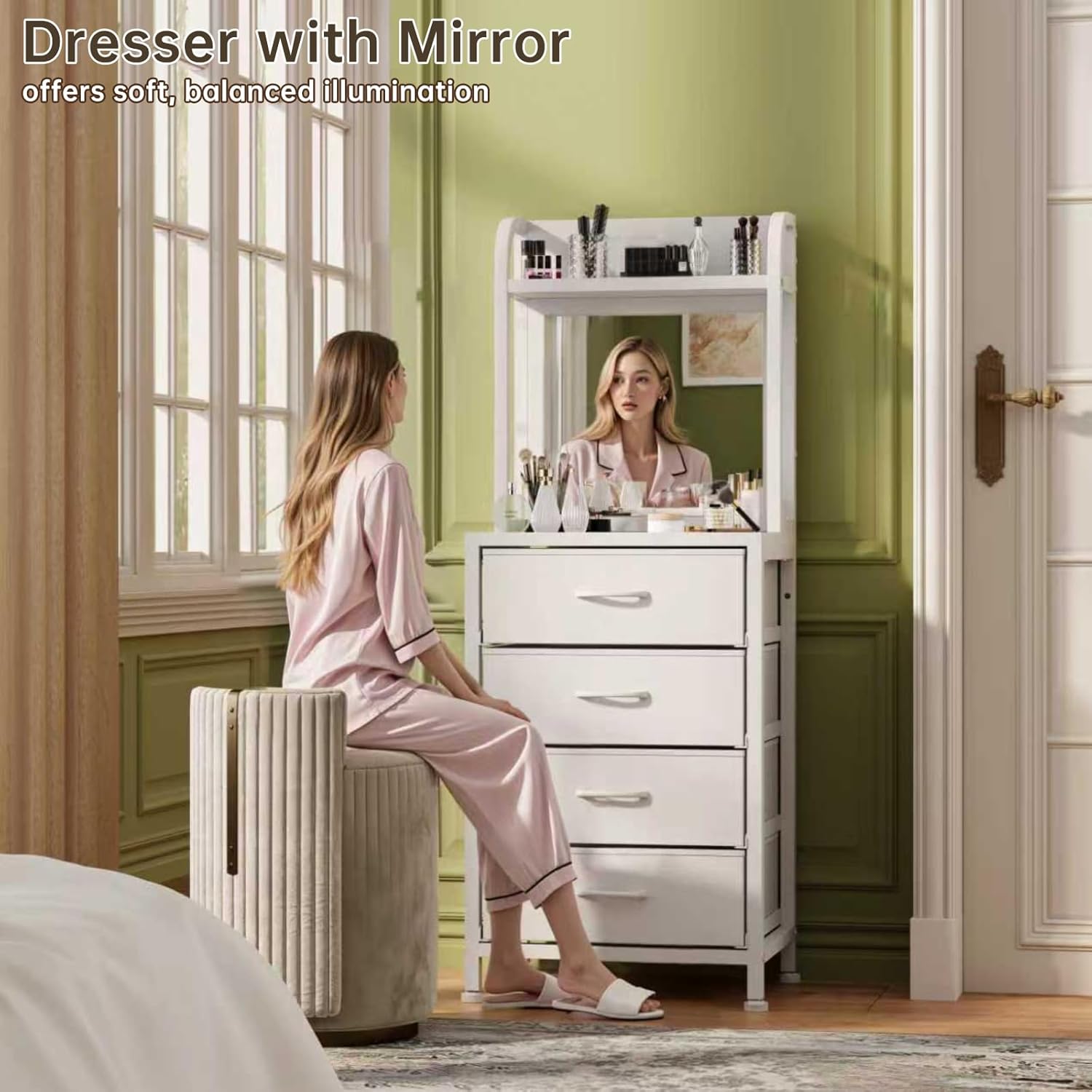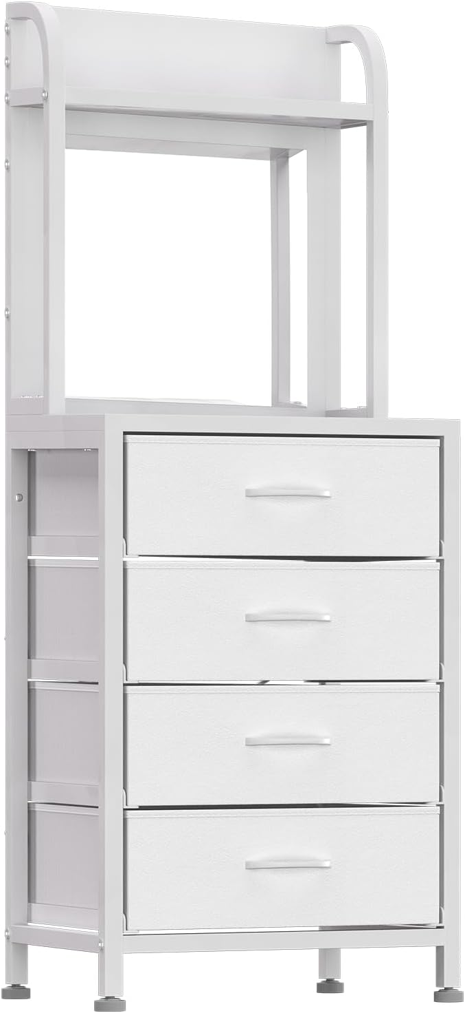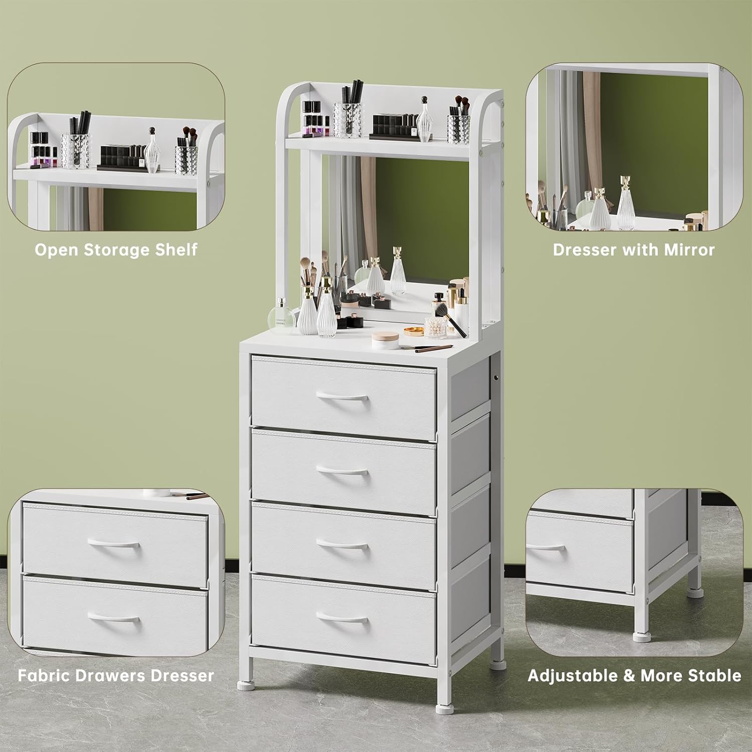 • Tall Dresser for Bedroom, 4 Drawer Dresser & Chests of Drawers with Mirror & Open Shelves, Vertical Vanity Storage Cabinet for Small Space