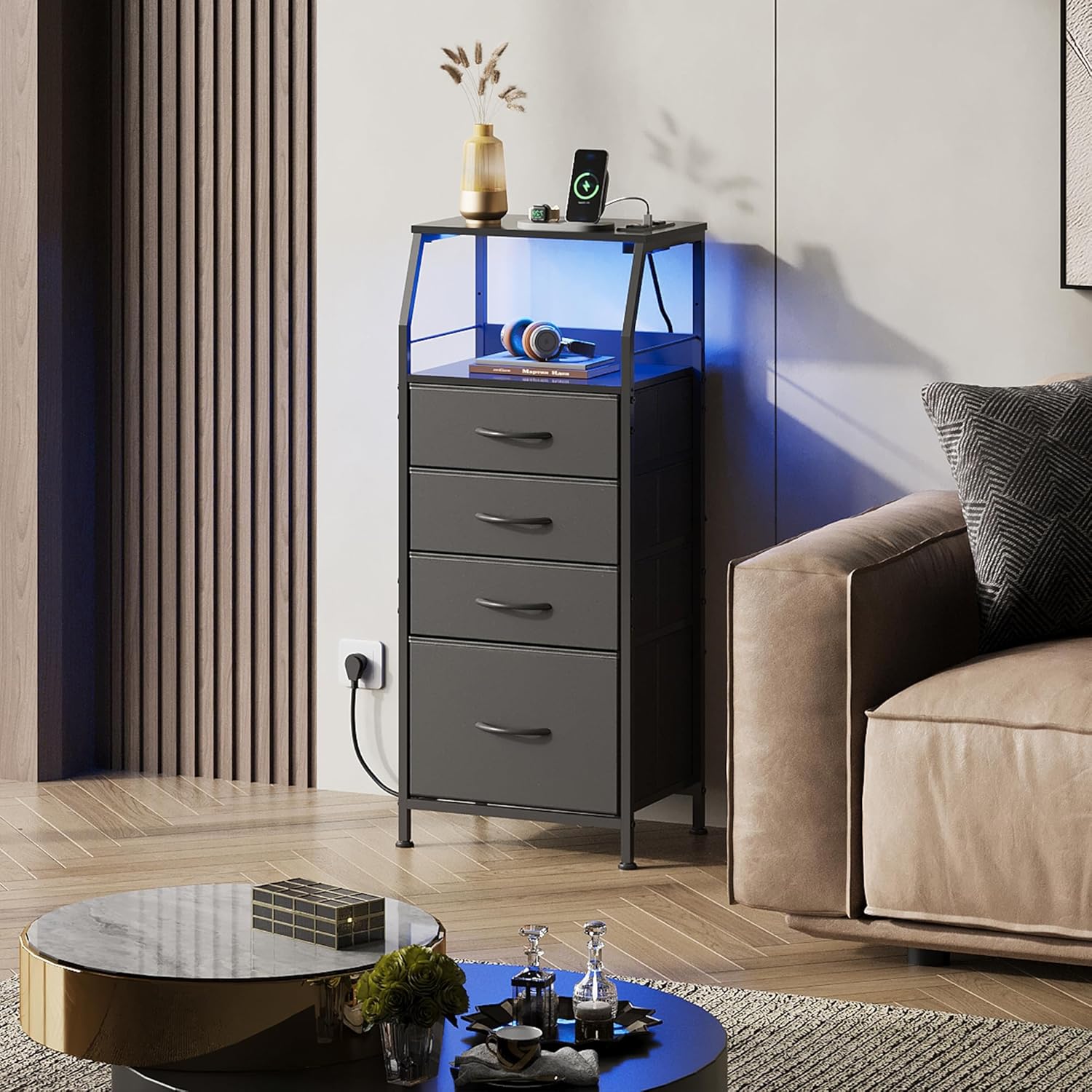 • WLIVE Night Stand with Charger Station, LED Nightstand with 4 Fabric Drawers and Storage Shelf, Tall Dresser for Bedroom